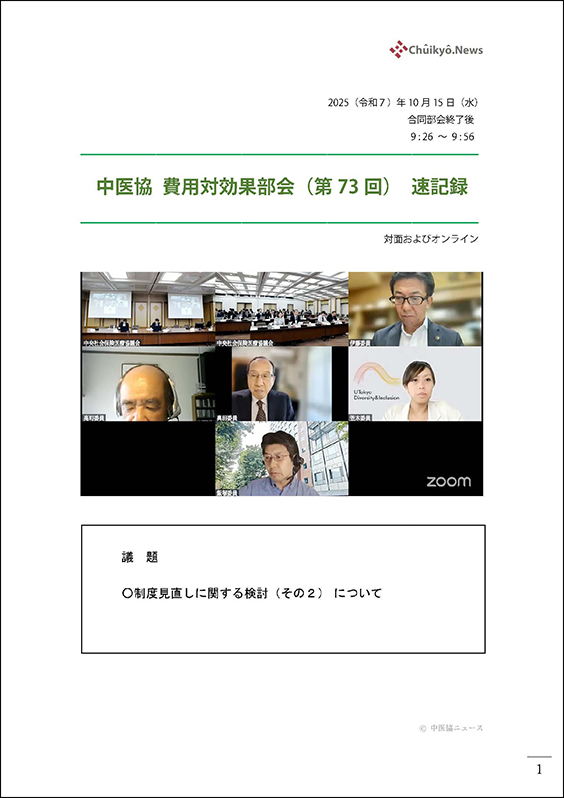 2025年10月15日(水)に都内で開催され、YouTubeでライブ配信された第73回中央社会保険医療協議会(中医協)費用対効果評価専門部会の速記録(非公式)です。弊社が独自に作成したものですので、厚生労働省の公式議事録とは異なることにご注意ください。