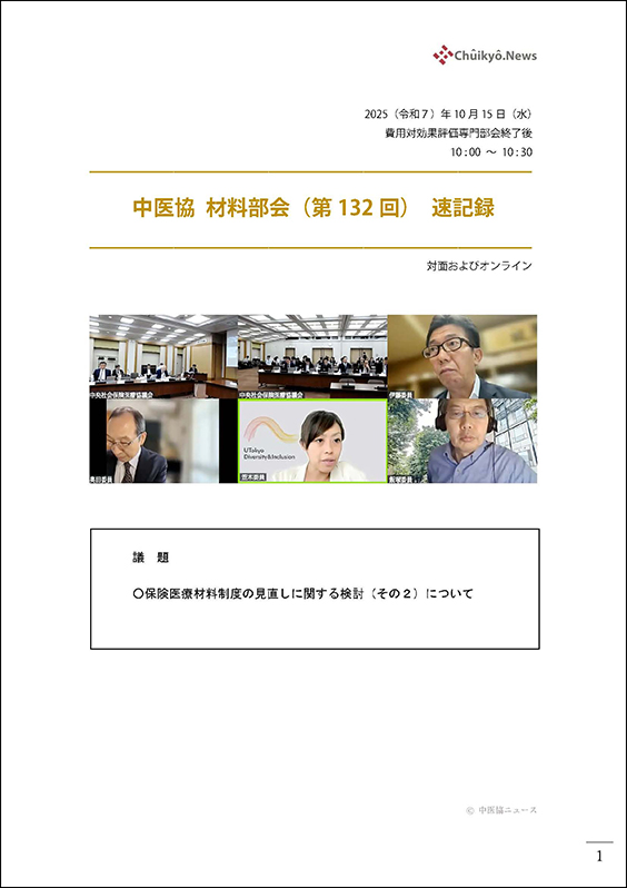 2025年10月15日(水)に開催され、YouTube でライブ配信された第132回中央社会保険医療協議会(中医協)保険医療材料専門部会の速記録(非公式)です。弊社が独自に作成したものですので、厚生労働省の公式議事録とは異なることにご注意ください。